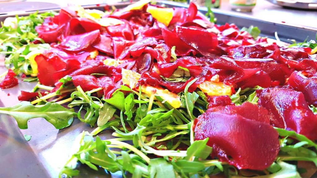 Als Vorspeise wurde Carpaccio von roter Bete mit Orangenfilets auf Rucolabett sowie ein Meerrettich-Kurkuma-Dip mit frischem Koriander zubereitet.