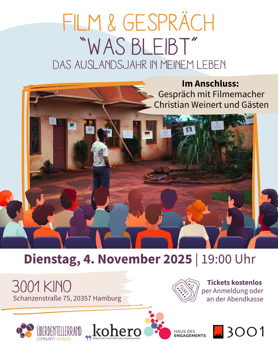Wir zeigen den Dokumentarfilm „Was bleibt? – Das Auslandsjahr in meinem Leben“. Er wirft die Frage auf: Wie prägt ein Freiwilligendienst das Leben danach? Sieben ehemalige weltwärts-Freiwillige blicken einige Jahre später zurück – mit Bildern, Geschichten und Gefühlen aus dieser intensiven Zeit.