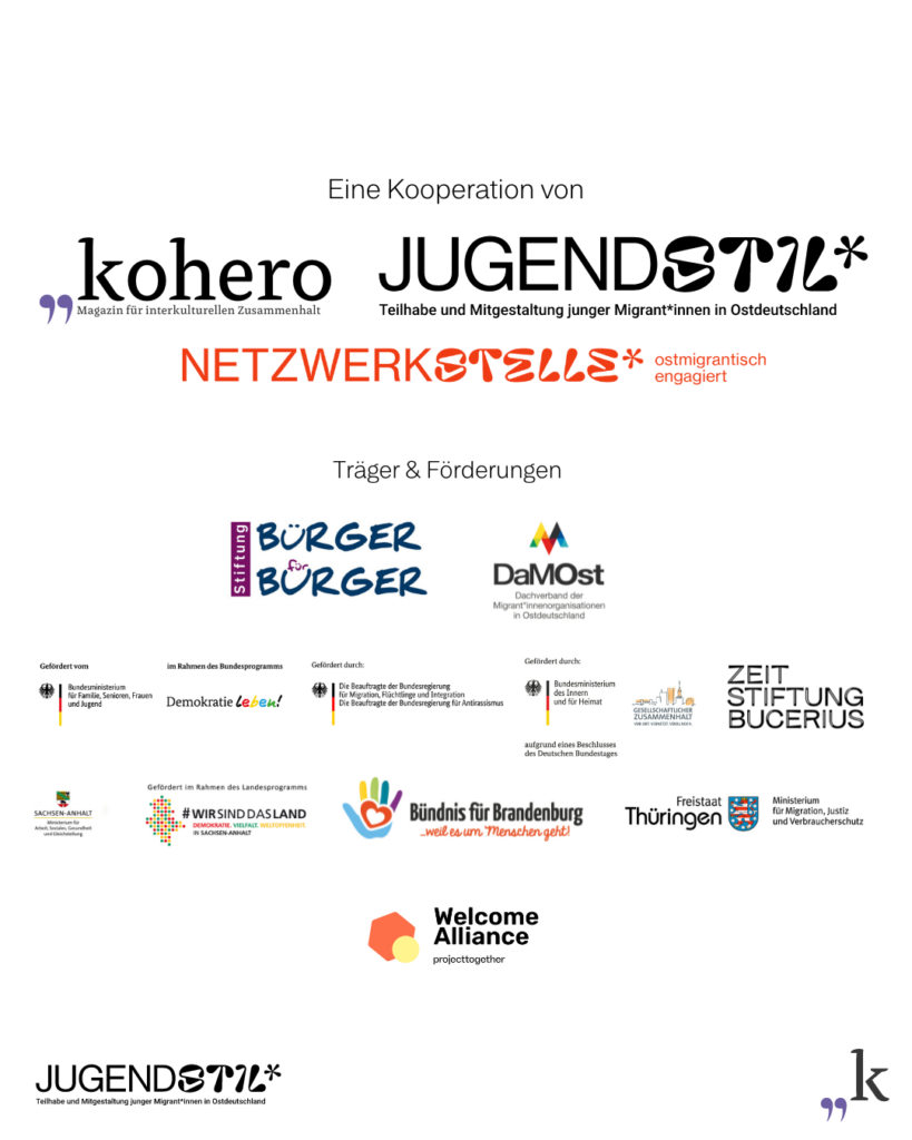 Feier mit kohero und JUGENDSTIL* die Veröffentlichung der neuesten kohero-Printausgabe, die sich ganz dem Thema Ostdeutschland widmet! Mit Beiträgen über Vertragsarbeiter*innen, Selbstorganisation, Hoffnung, migrantisches Engagement und Widerstand im Osten.